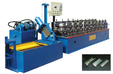 液压c型钢机- 液压c型钢机由装料架、装料架底座、成型辊轮、校正装置、电脑控制系统、液压传动、液压冲孔、液压切断装置组成